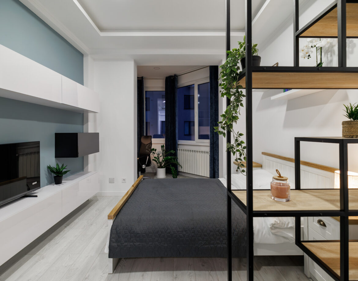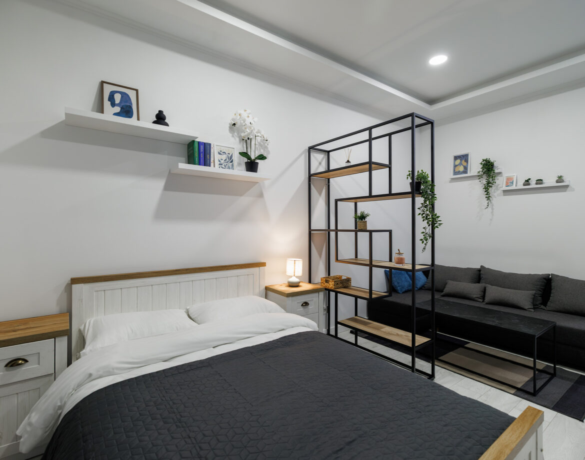 Bright and quiet apartment located in the city center, ideal for both relaxation and work. The space includes a comfortable bedroom and a modern living room.