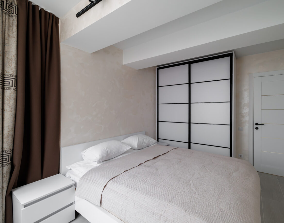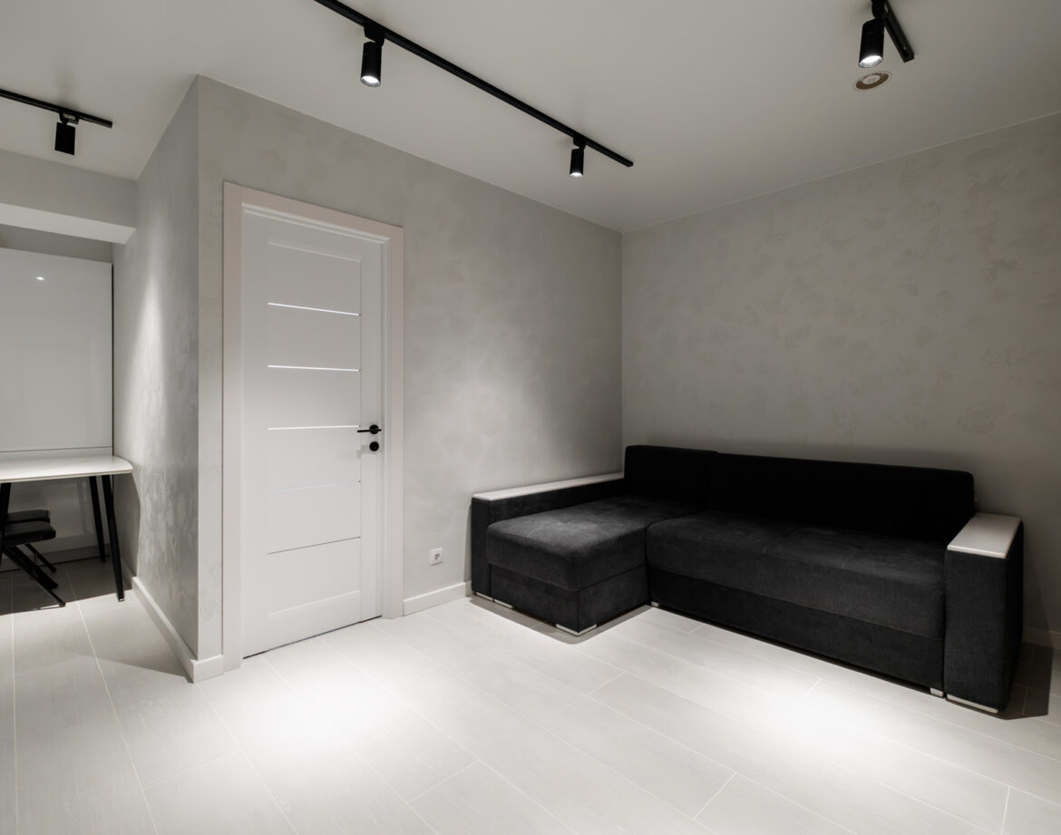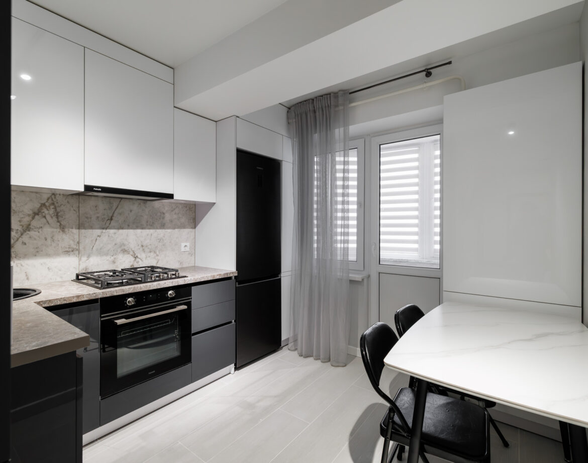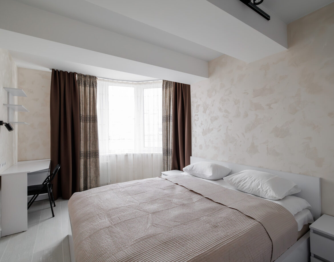 The apartment features a cozy bedroom, a modern living room with a large sofa, and a fully equipped kitchen — ideal for relaxing after a day of exploring or working in Chișinău. The neutral tones, wood accents, and elegant lighting create a calm and welcoming atmosphere.