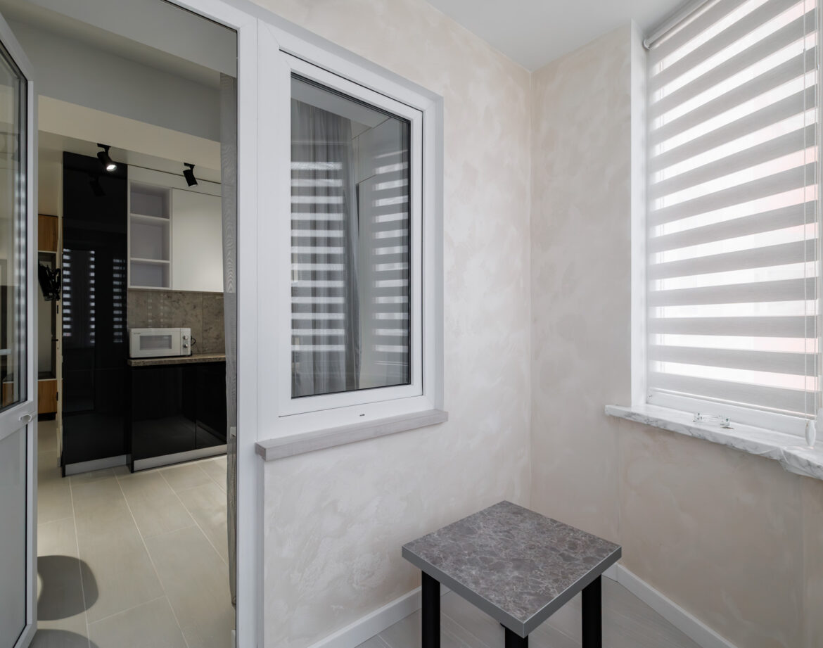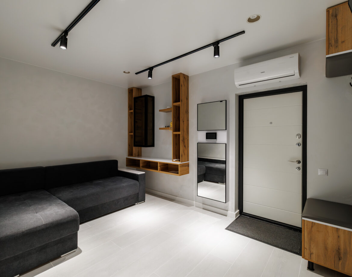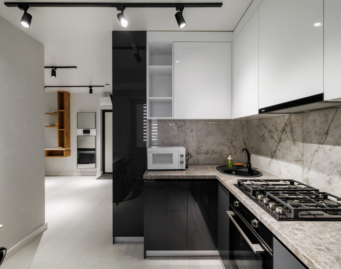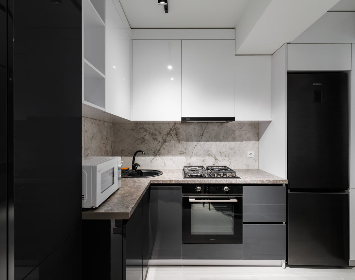 The apartment features a cozy bedroom, a modern living room with a large sofa, and a fully equipped kitchen — ideal for relaxing after a day of exploring or working in Chișinău. The neutral tones, wood accents, and elegant lighting create a calm and welcoming atmosphere.