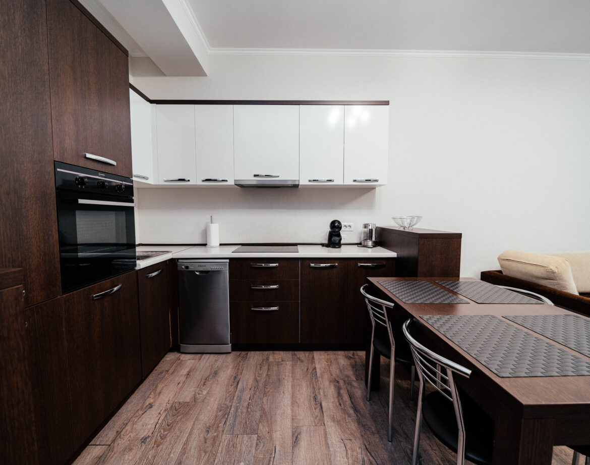 The apartment features a cozy bedroom with a double bed, a spacious living room with sofa and TV, and a fully equipped kitchen with everything you need for a short or long stay. Neutral tones, warm lighting, and elegant décor create a relaxing and welcoming atmosphere.