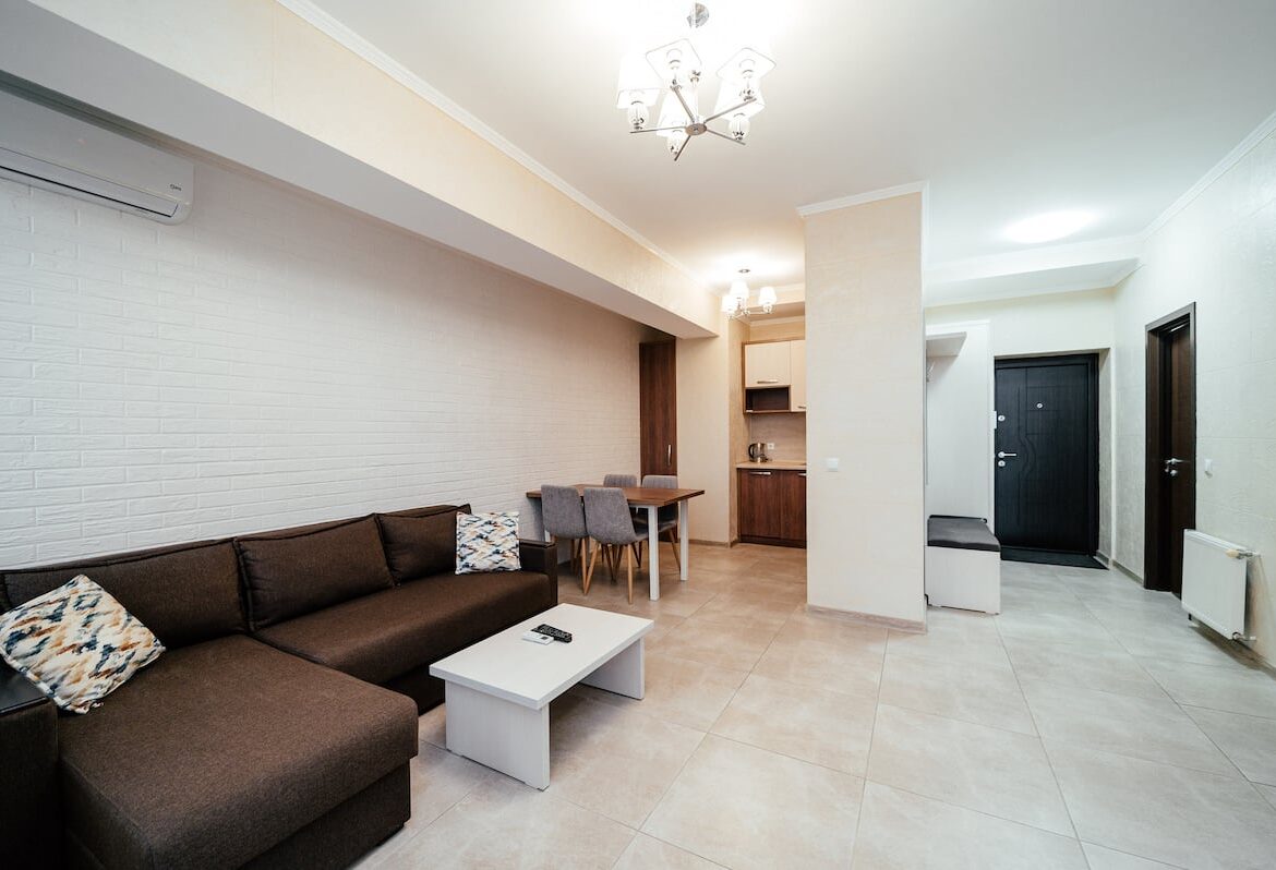 The apartment features a cozy bedroom with a double bed, a bright living room with a large sofa, and a fully equipped kitchen with everything you need for short or extended stays. The clean design, warm lighting, and natural tones create a relaxing, home-like atmosphere.